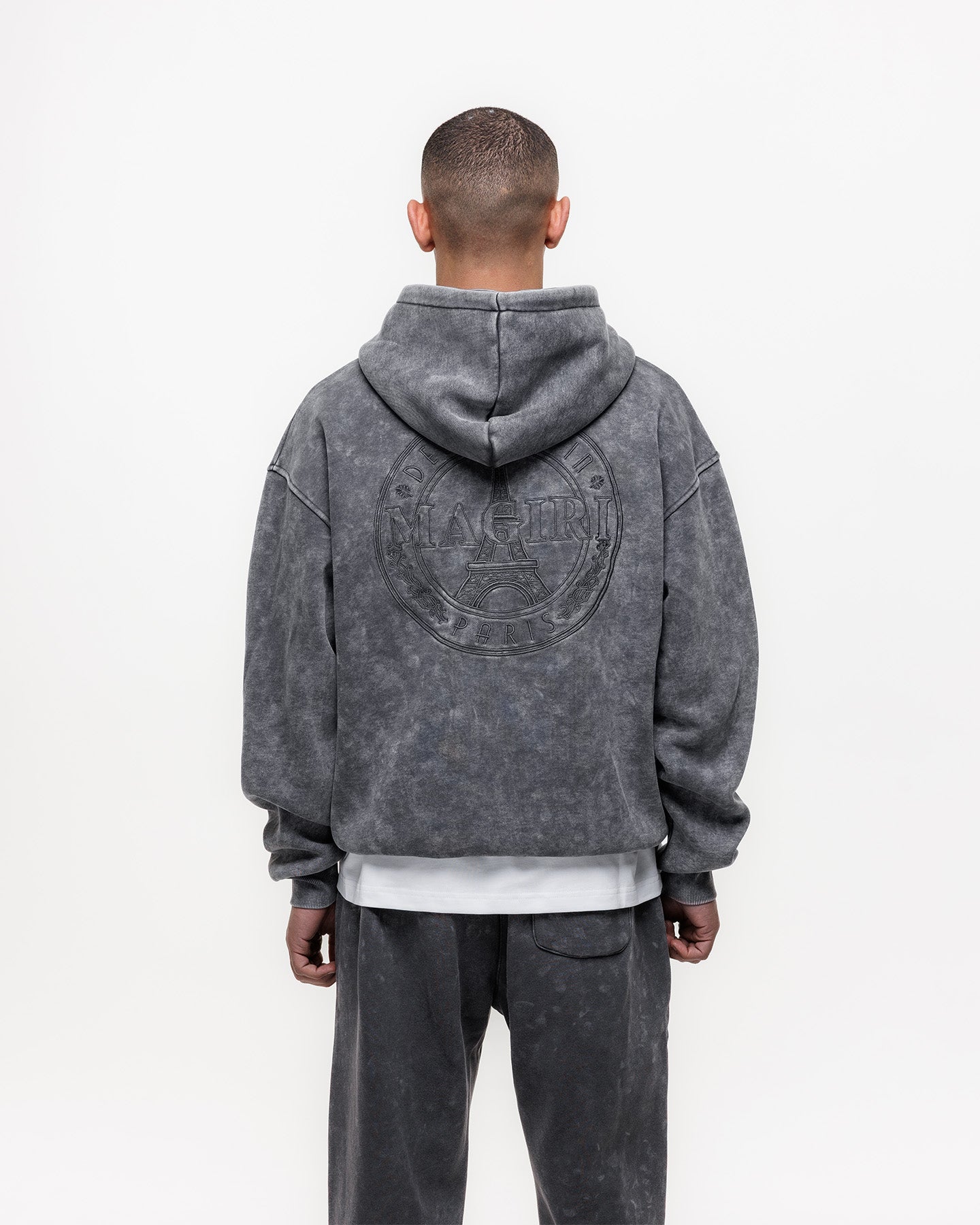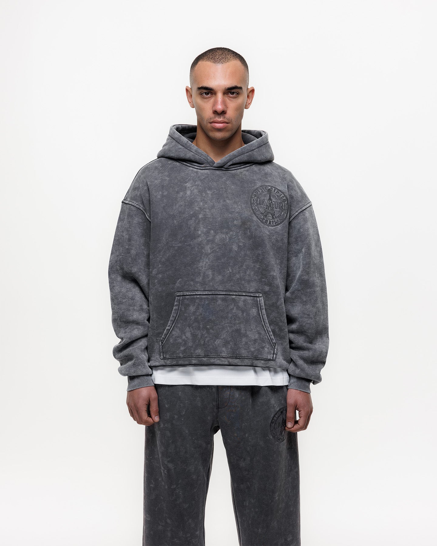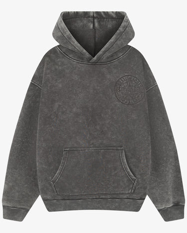 The Grey Acid Washed Hoodie has been crafted from premium heavyweight cotton in a classic hoodie silhouette. Featuring a unique acid wash finish, each piece carries subtle variations for a distinctive look. Finished with a soft velvet lining, embroidered front patch and a large embroidered patch at the rear.